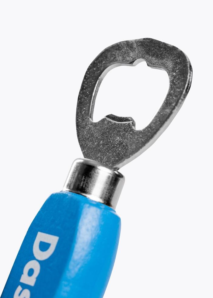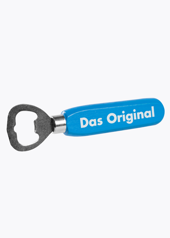 Flaschenöffner mit Holzgriff – lackiert in Spezi-Blau mit Beschriftung Spezi Original