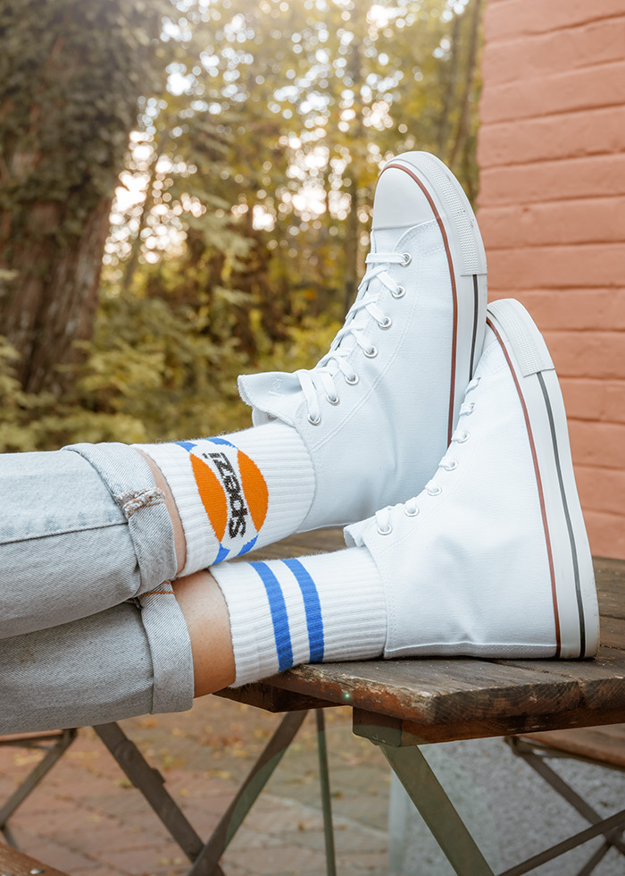 Zwei Streifen in blau mit dem Retro SPEZI-LOGO auf der Außenseite