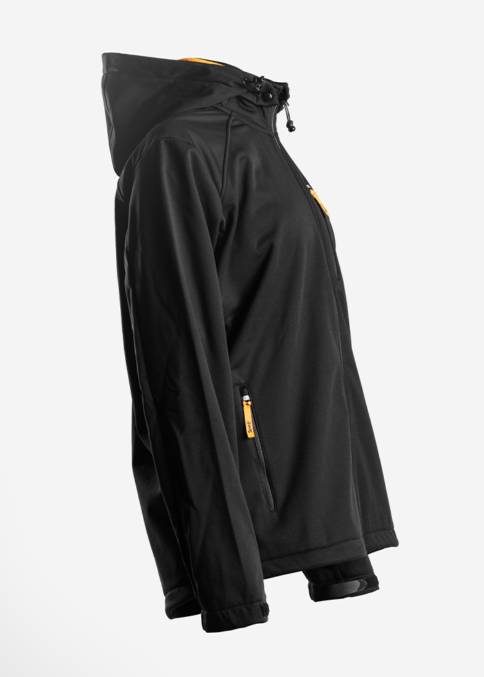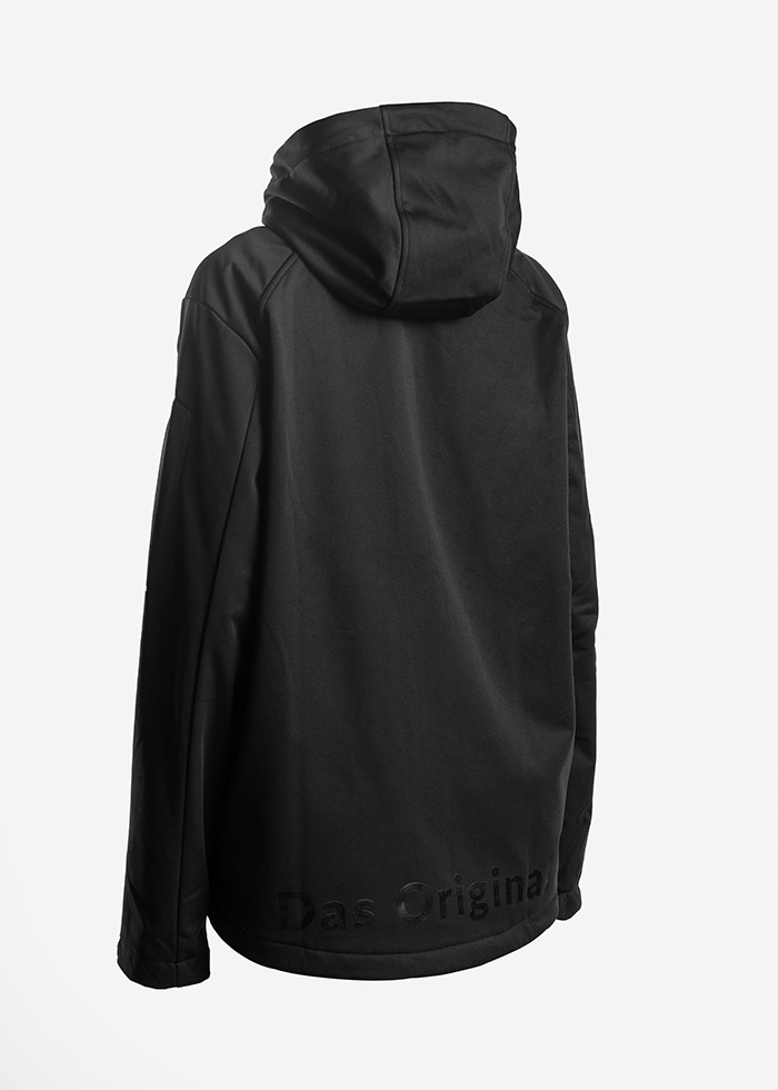 Softshelljacke mit abgerundetem Rückenteil - Schriftzug "Das Original" in schwarz, weitenverstellbarem Saumabschluss mit Tunnelkordelzug und Stoppern