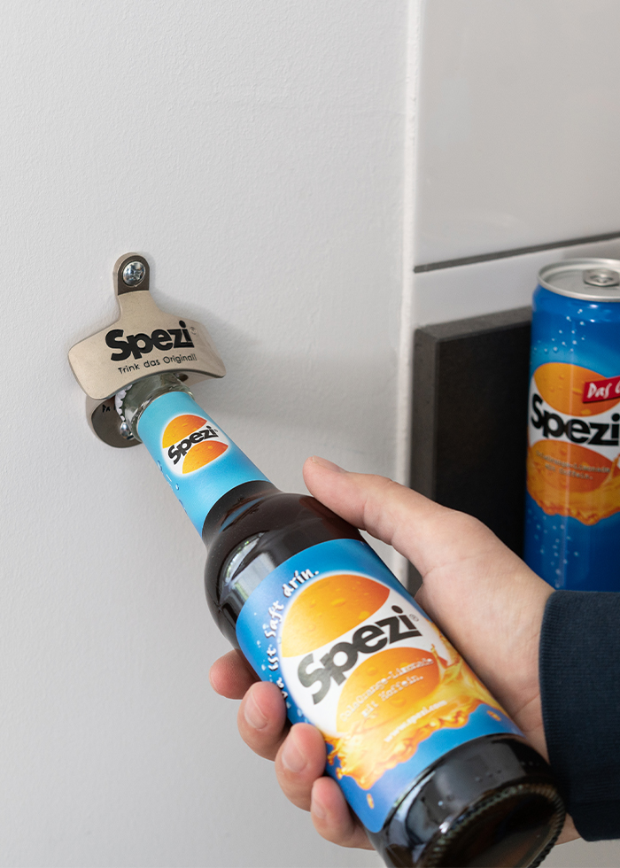 Flaschenöffner Gusseisen Wandmontage für Bar und Küche Schriftzug Spezi in Schwarz