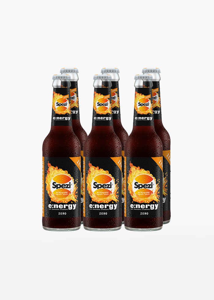 Spezi e:nergy ZERO in 6 Clubflaschen, als Powertray. Für mehr Power, schnellere Reaktion und bessere Konzentration, mit einer Packung Koffein und einer Dosis Taurin.